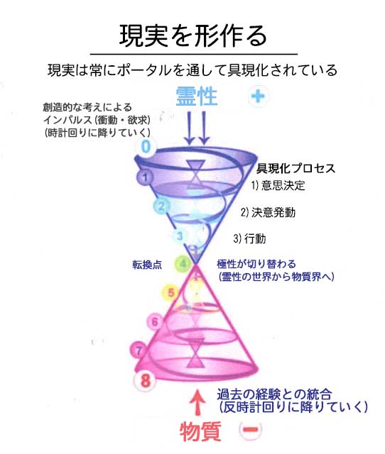 次の砂時計の図では、上の+極は霊性で、創造的な考えによるインパルス(衝動・欲求)を表し、0から3まで時計回りに降りていって、地面(地球)を表している。
